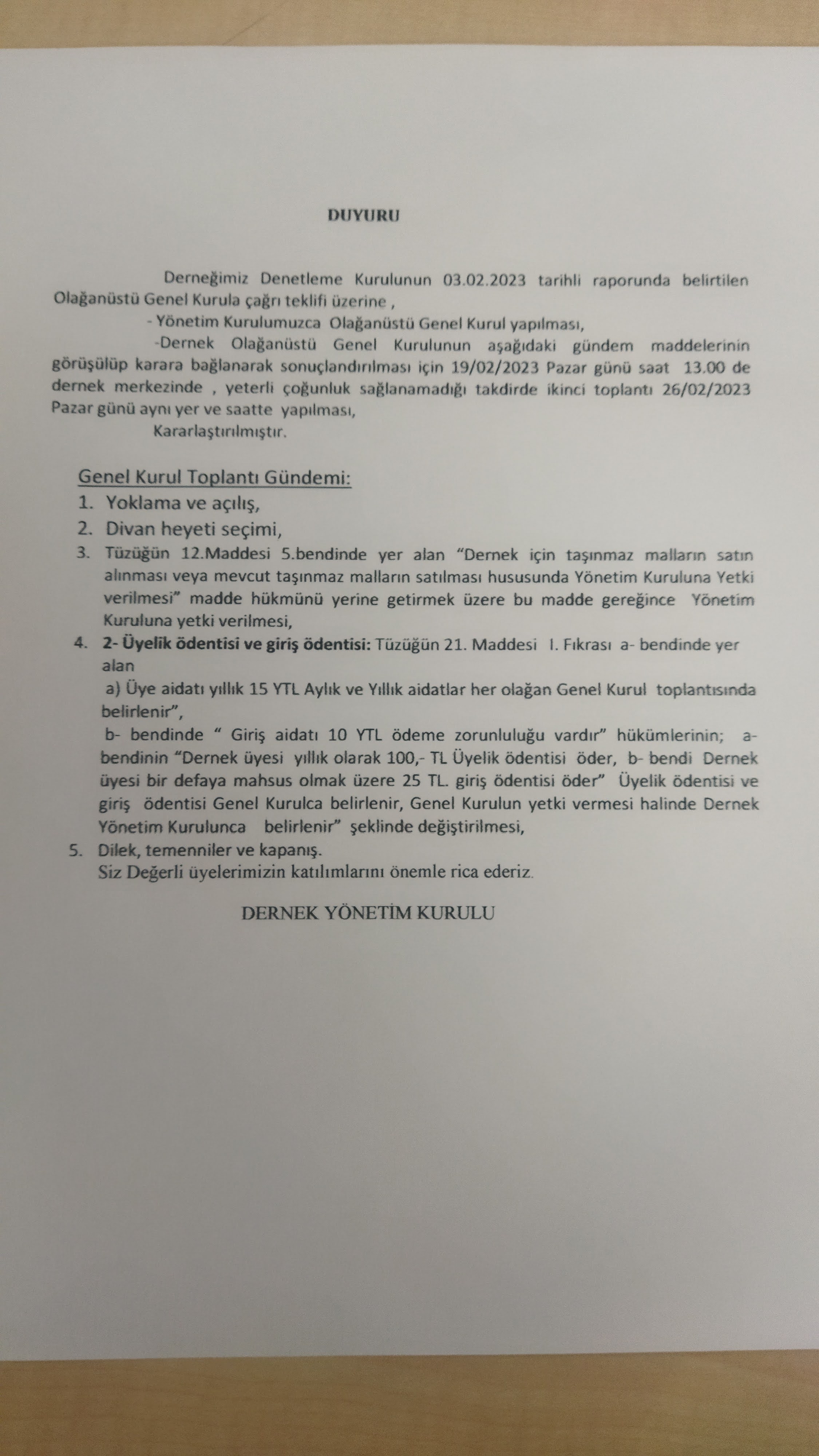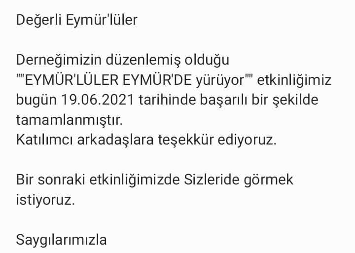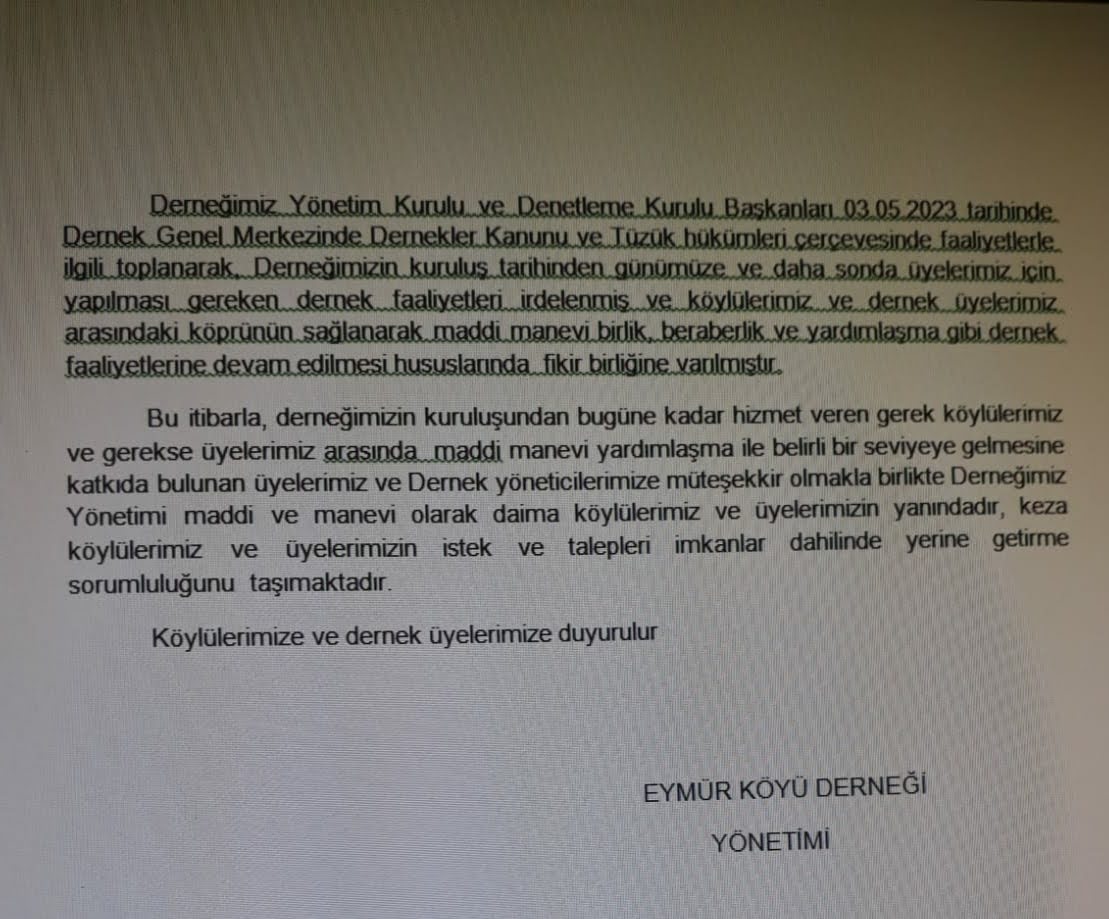 DERNEĞİMİZ MERKEZİNDE 26-02-2023 TARİHİNDE YAPILAN OLAĞANÜSTÜ GENEL KURUL TOPLANTISINDA KIRANIN SATINALINMASI İLE ÜYELİK AİDATLARININ ARTIRILMASI (YILLIK200.-₺) KONUSUNDA OY BİRLİĞİ İLE VERMİŞ OLDUĞUNUZ DESTEĞE VE KATKILARINIZA SONSUZ TEŞEKKÜRLER. TÜM ÜYELERİMİZE VE EYMÜR’LÜLERE SAĞLIKLI HUZURLU GÜZEL GÜNLER DİLERİZ.