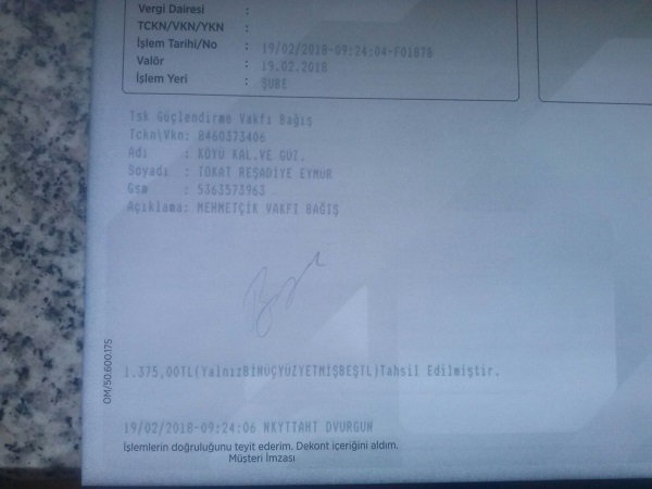 DERNEĞİMİZ AÇILIŞTA MEHMETÇİKLERİMİZE BAĞIŞ KANPANYASI YAPMIŞ AÇILIŞTA MEHMETÇİK VAKFINA (TSK GÜÇLENDİRME VAKFI)1375 TL BAĞIŞ TOPLANMIŞTIR. TÜM HEMŞERİLERİMİZE TEŞEKKÜR EDERİZ.ZİRAAT BANKASI HESABİNA YATIRILMIŞTIR.