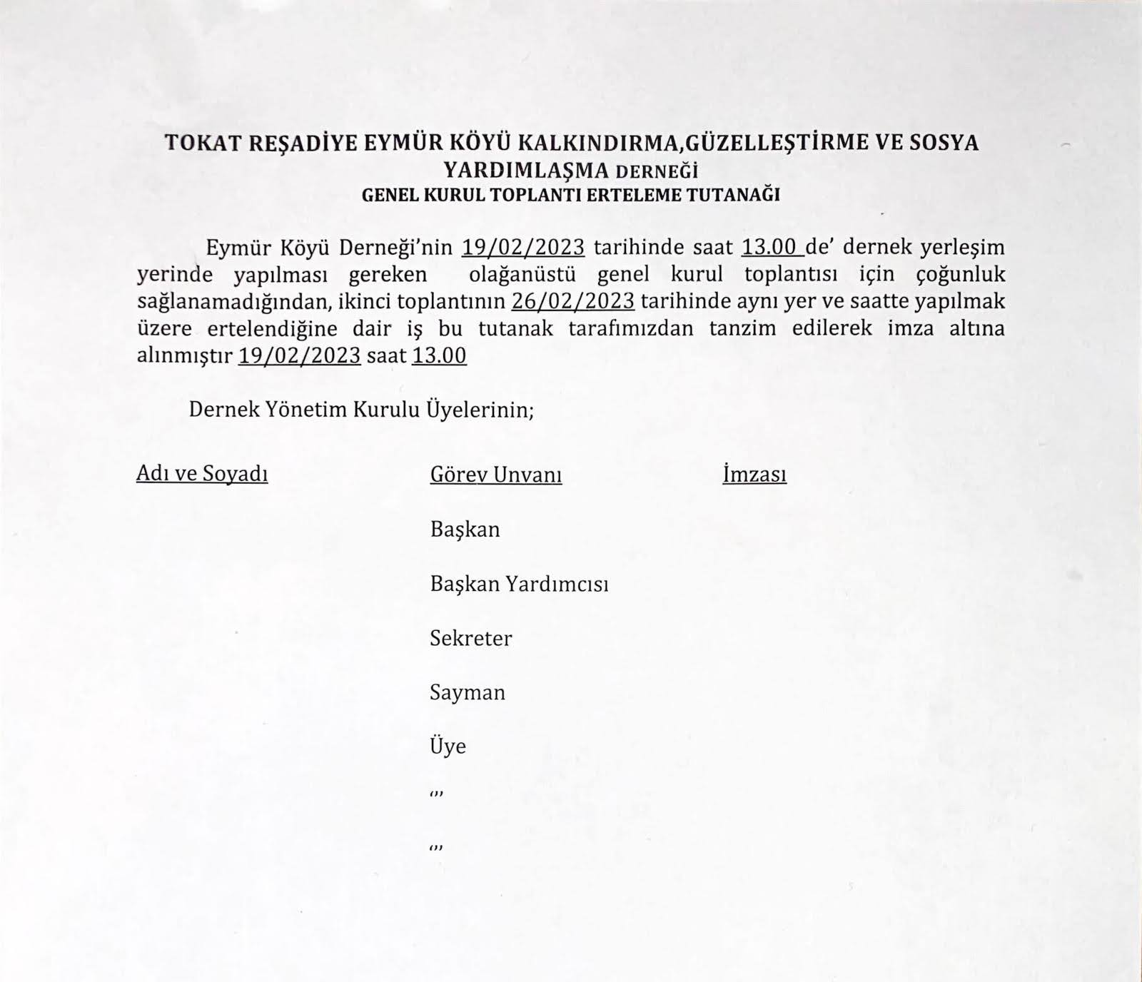 19-02-2023 toplantı çoğunluk olmadığı için 26.02.2023 tarihine ertelendi.