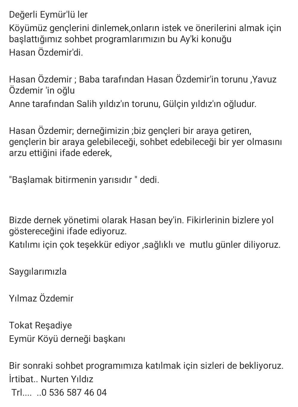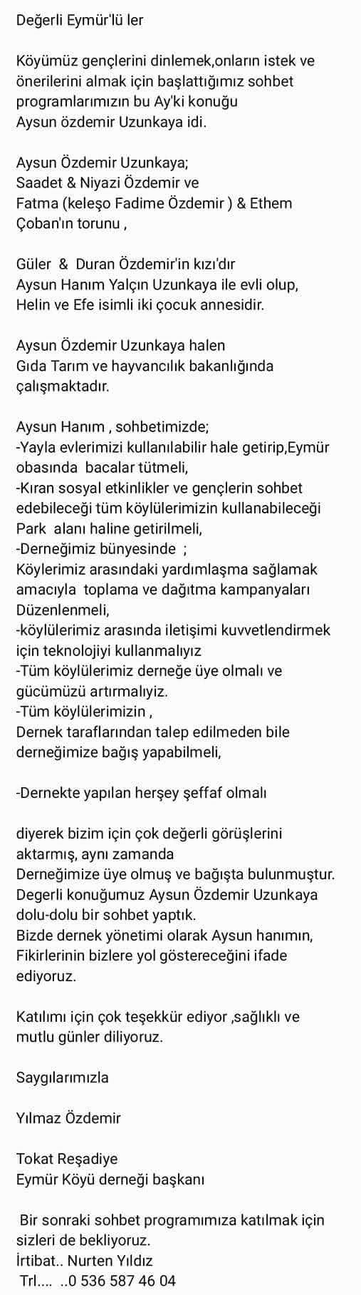 Diğer yönüyle üyelerimiz ve köylülerimizden Ankara’da ikamet edenlerden oluşan bir WhatsApp grubu kurulmuştur. Bu WhatsApp grubunun kurulması, köylülerimiz arasındaki iletişimi sağlamak, hastalık, ölüm, düğün, yardımlaşma, bayram vs gibi bildirimleri paylaşmaktır. Dernek üyelerimiz grubunun dışında oluşturulan bu grupta hakaret olmaksızın saygınlık ve nezaket içinde “hastalık, ölüm, düğün, yardımlaşma, bayramlaşma” konu başlıkları dahilinde yazışma yapılması sizlerden ricamızdır.