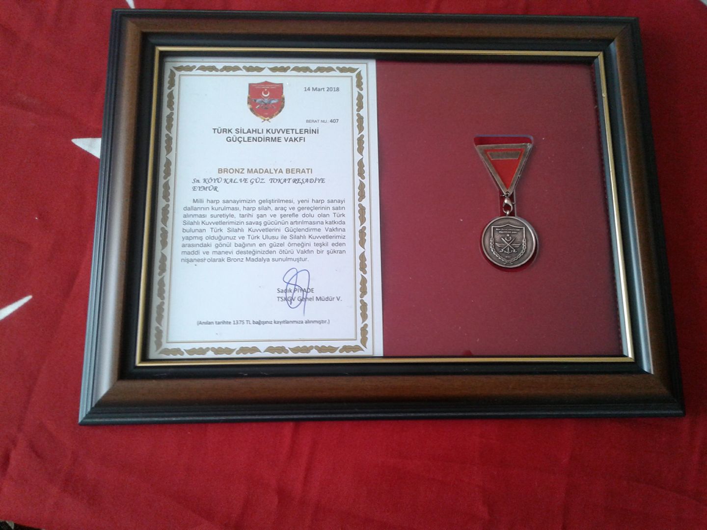 YAPMIŞ OLDUĞU MADDİ VE MANEVİ YARDIMLARDAN DOLAYI BRONZ MADALYA YA LAİK GÖRÜLMÜŞTÜR. TEŞEKKÜR EDERİZ.