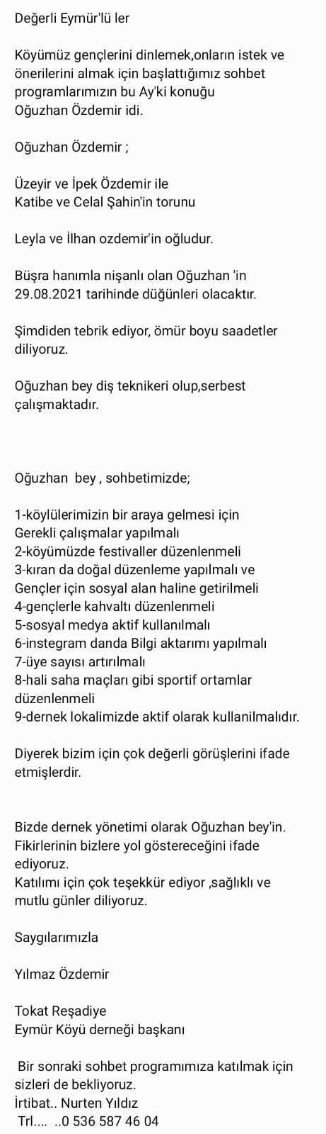 18 yaşını doldurmuş Eymür lü bir gencimizle dernek lokalimizde sohbet edip ,onları dinlemek fikirlerini almak istiyoruz.
